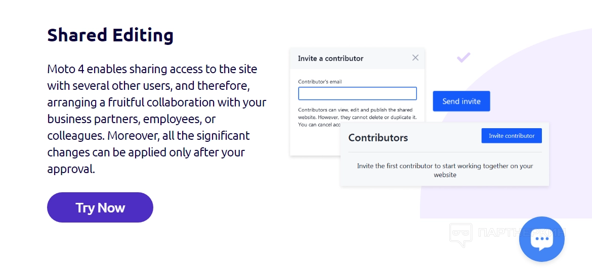 позволяет разделить доступ к сайту с несколькими другими пользователями. Все изменения применяются только после одобрения основного пользователя. Это дает полный контроль над созданием сайта.