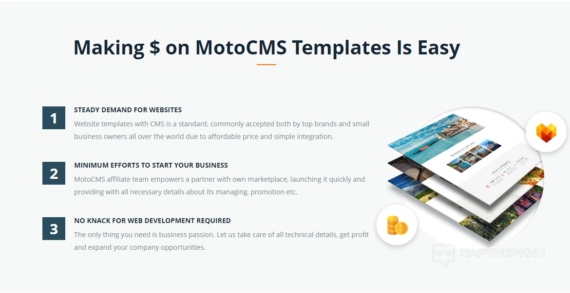 Партнерская команда MotoCMS предоставляет партнеру собственный маркетплейс, быстро запускает его и предоставляет всю необходимую информацию по его управлению и продвижению. После этого партнер может продавать готовые шаблоны под своим брендом.