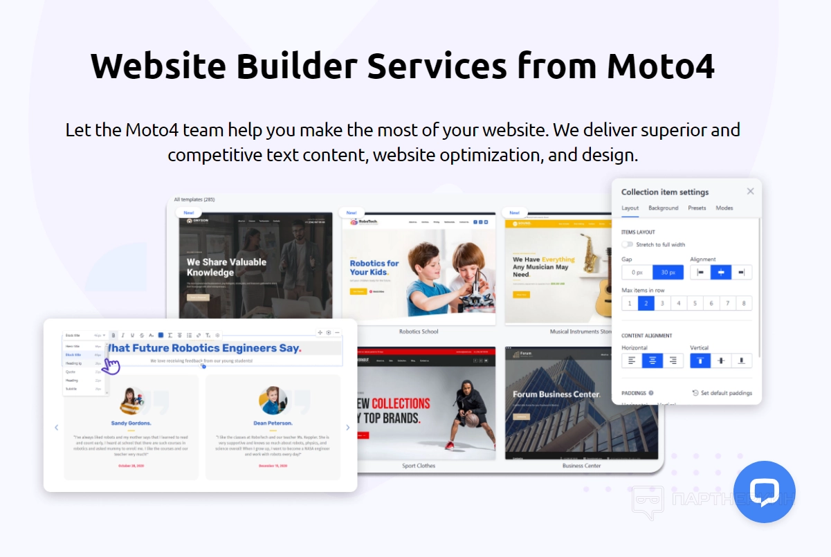 предлагает смарт-дизайн, который учитывает специфические потребности различных ниш. Независимо от тематики сайта, здесь можно найти шаблон, который будет соответствовать ожиданиям пользователей. Шаблоны выполнены на высоком уровне, сочетают красоту и функциональность.