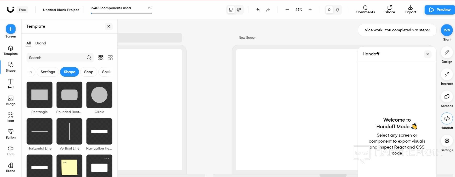Для удобства работы вы можете добавлять новые экраны для создания дополнительных страниц проекта или использовать готовые шаблоны. Это помогает быстрее приступить к разработке, основываясь на уже имеющихся элементах или дизайнах.