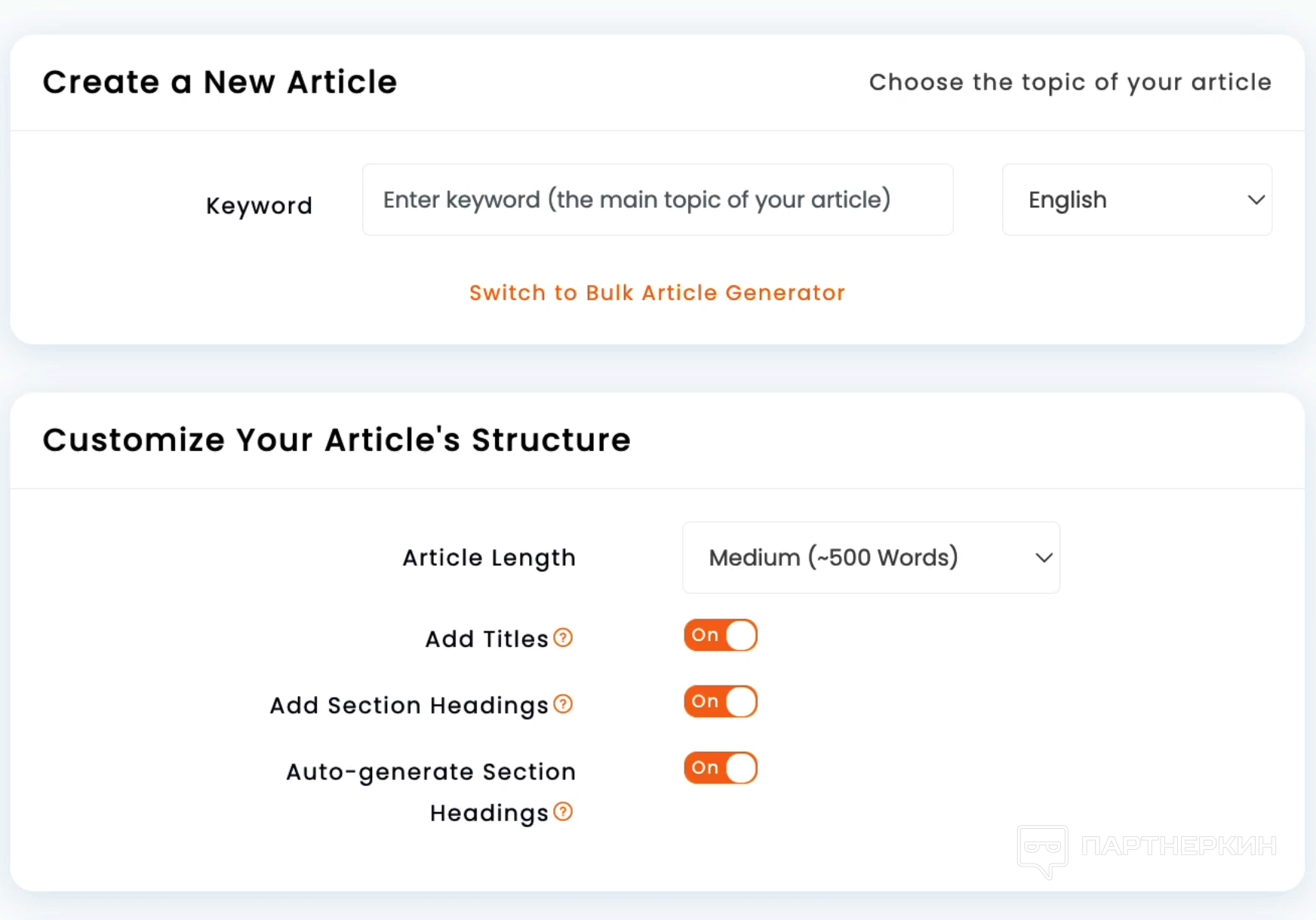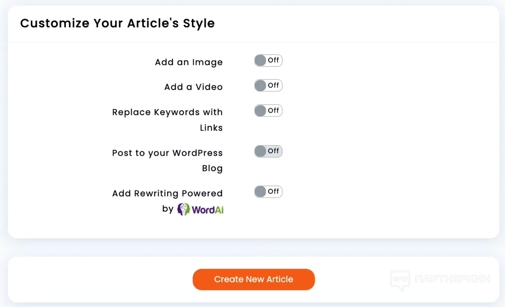 При нажатии на кнопку «New article» в меню слева нужно будет вписать в соответствующее окно необходимые ключевые слова и выбрать функции гибкой настройки генератора статьи: