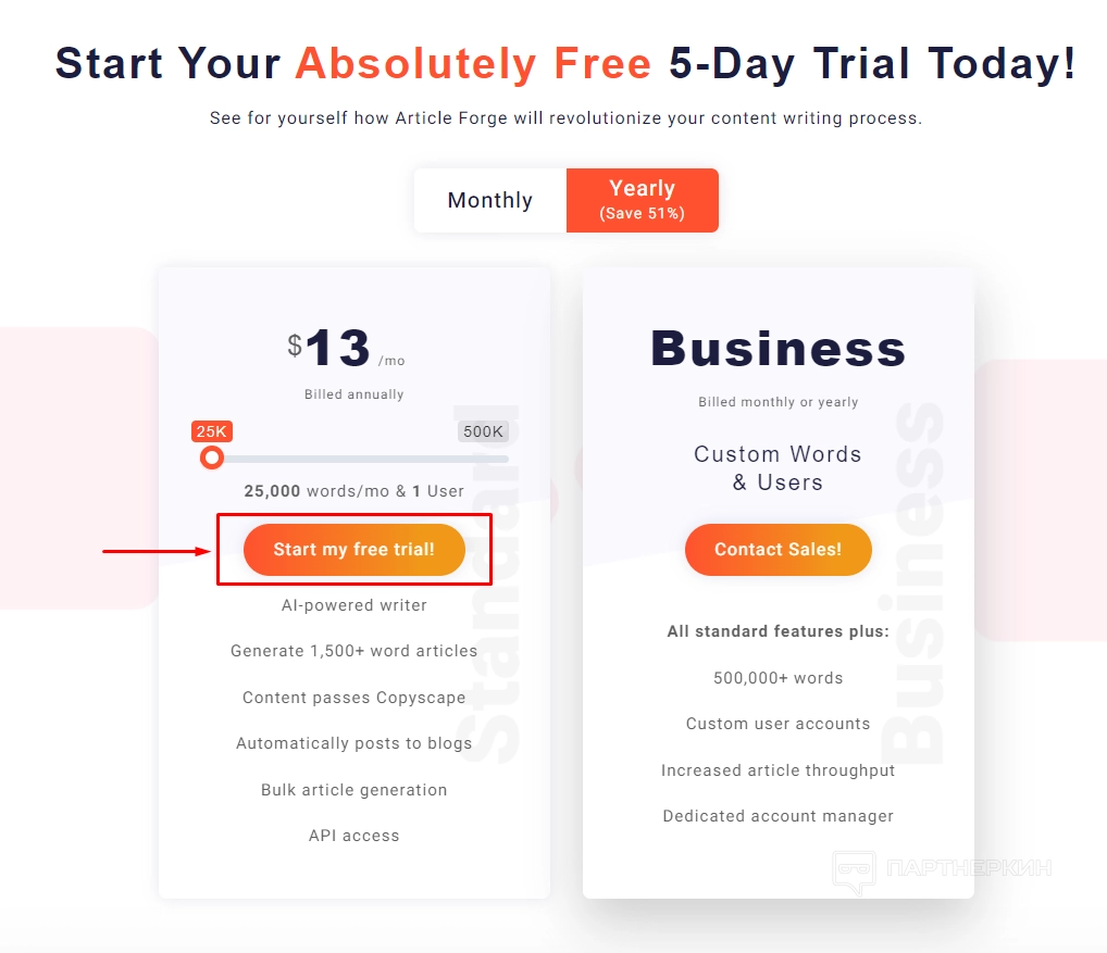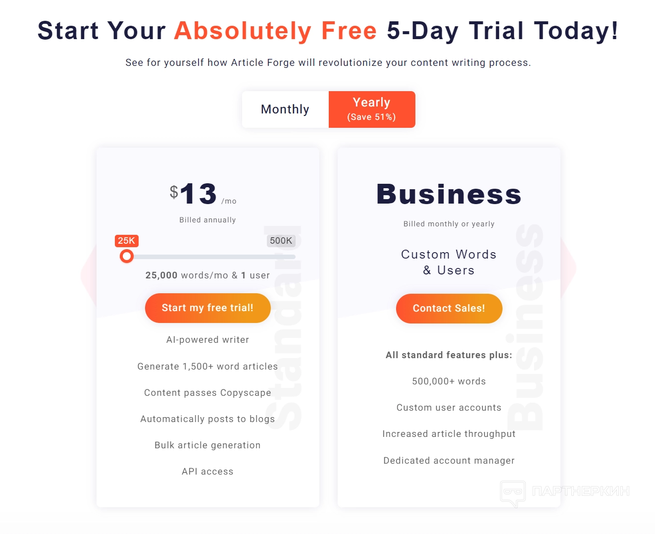 Годовая подписка - $13 в месяц при оплате за год. Включает 25,000 слов в месяц, AI-писатель, контент, проходящий проверку Copyscape, автоматическую публикацию на блогах, доступ к базе данных с более чем 1,5 миллионами слов/статей, генерацию статей через API.