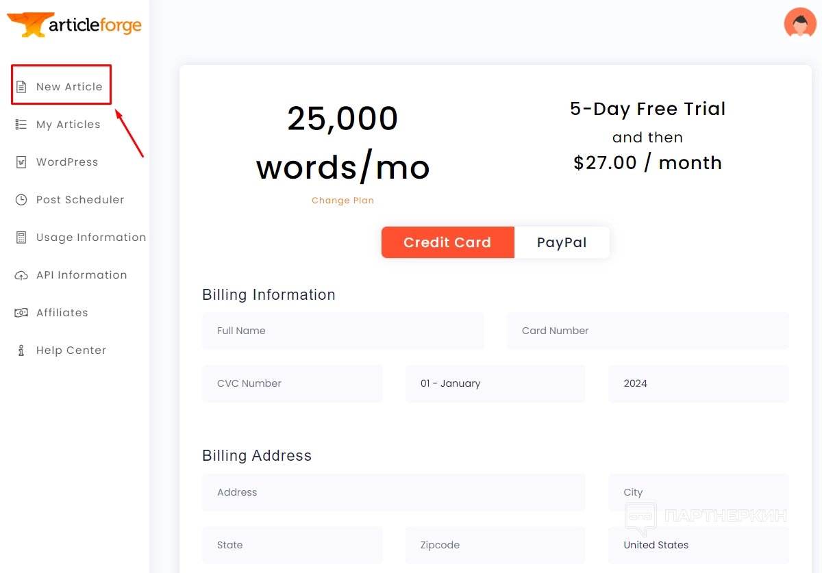 После этого появится возможность сгенерировать свою первую статью. Однако сервис не сможет запустить бесплатный период пока не будут указаны платежные данные.
