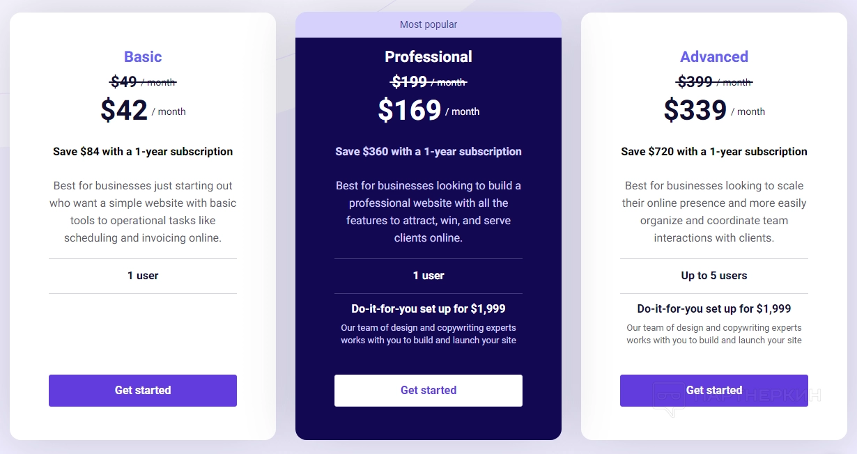 - Basic Plan позволяет создавать сайты, настраивать прием клиентов, использовать онлайн-планирование встреч и получать оплату онлайн. Стоимость составляет $42 в месяц при годовой подписке.