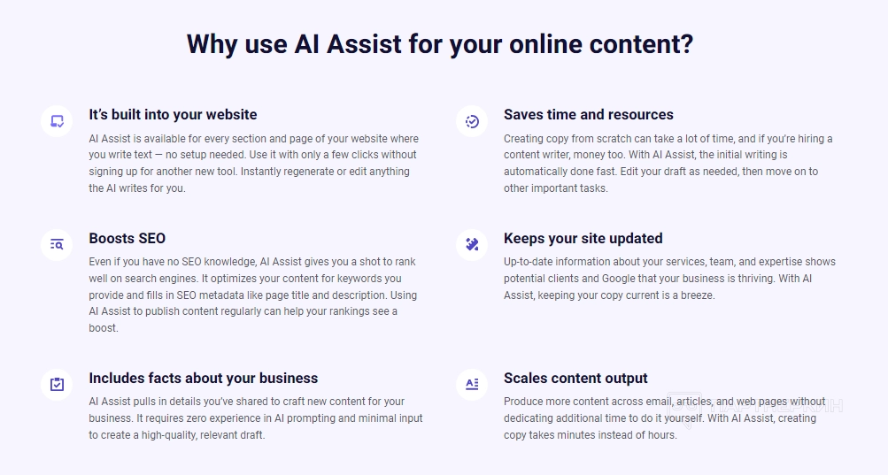 Встроенный ИИ помощник и возможности автоматизации упрощают управление сайтом и маркетингом.