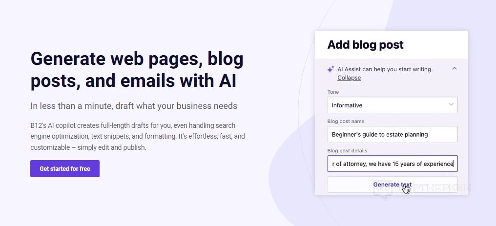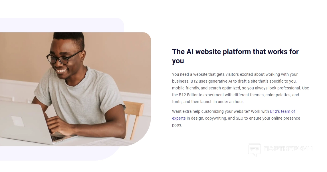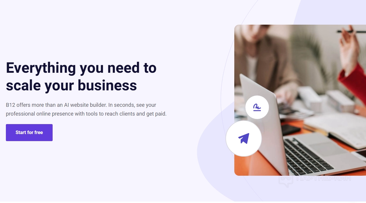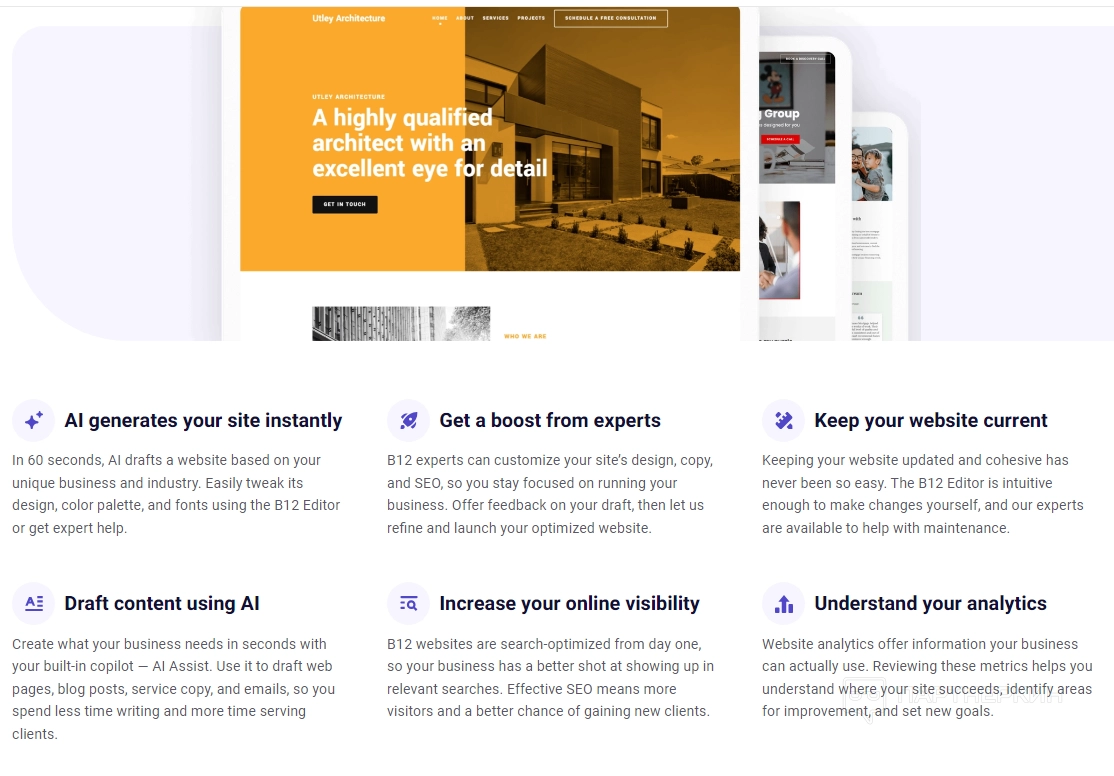 Одной из ключевых возможностей B12 является автоматизированное создание сайтов с помощью искусственного интеллекта. Пользователи могут быстро настроить сайт: добавить текст, изображения и инструменты для взаимодействия с клиентами.