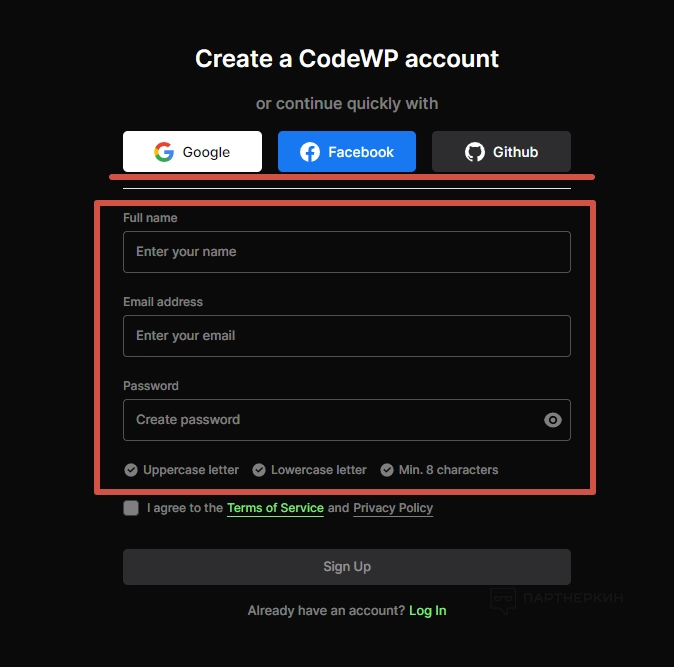 Для регистрации нужно указать имя, электронную почту и пароль. Также можно пройти авторизацию с помощью аккаунтов Google, Facebook* или GitHub.