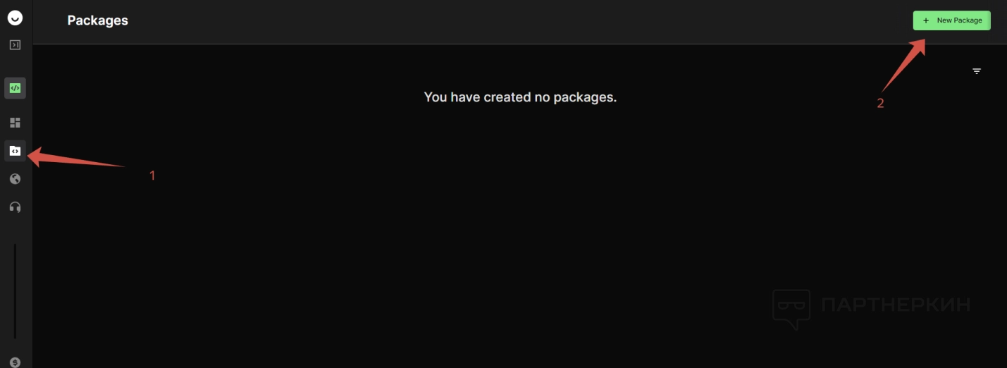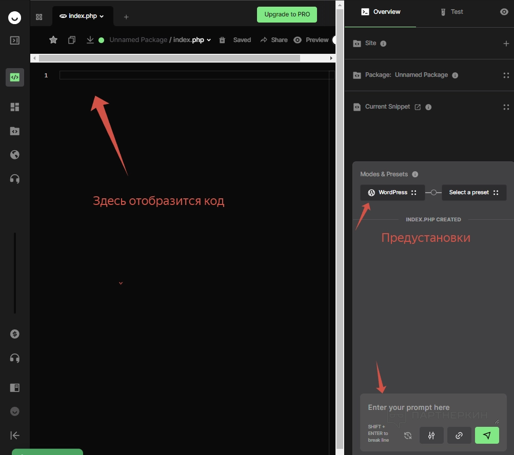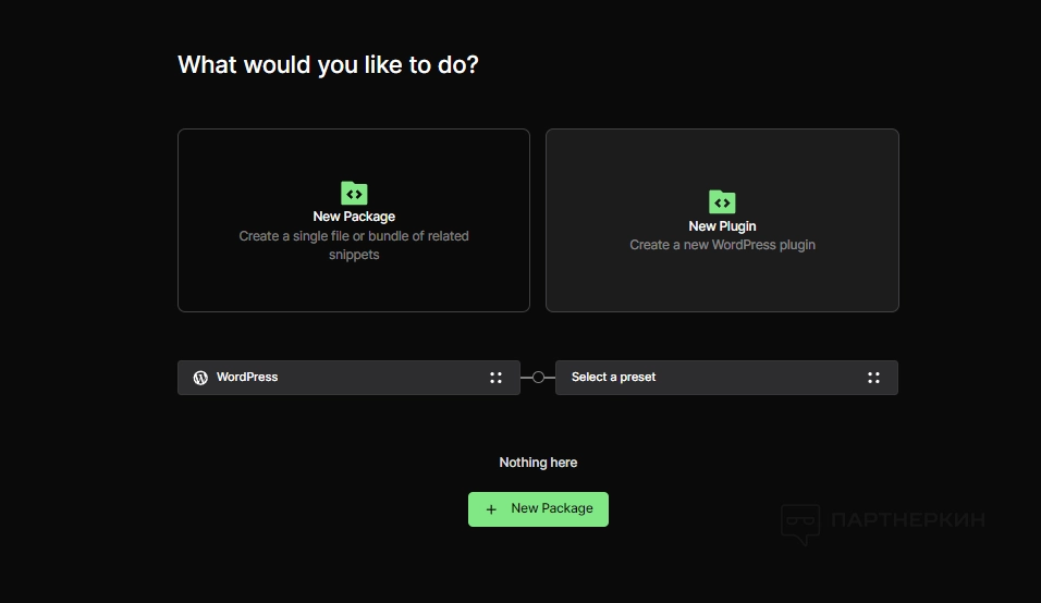 Выбрав «Новый код», откроется окно, где нужно указать пакет (WordPress и т.д.) и предустановку: