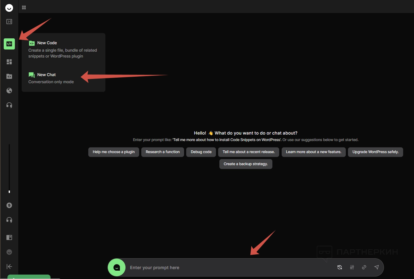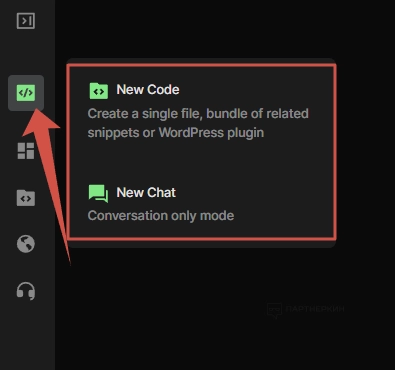 Для генерации кода или работы с чатом нужно перейти в раздел «Фрагменты», который расположен в верхней части панели управления. Тут же откроется меню, где можно выбрать «Новый код» и «Новый чат».
