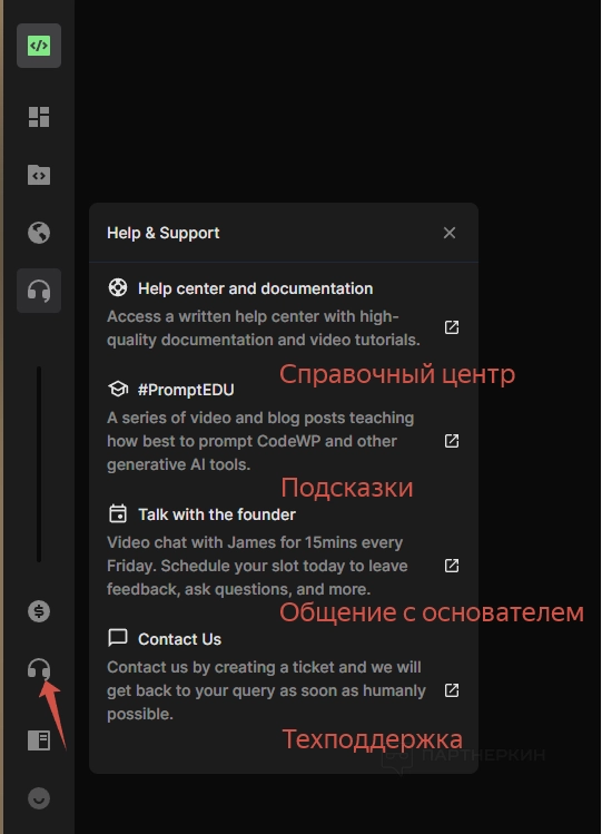 Ниже находится раздел со справкой и технической поддержкой. Для связи со специалистами сервиса предусмотрена специальная форма. По умолчанию отвечает бот, но если вопрос сложный, система автоматически переключается на сотрудника службы. Тут же есть справочный центр, документация и подсказки.