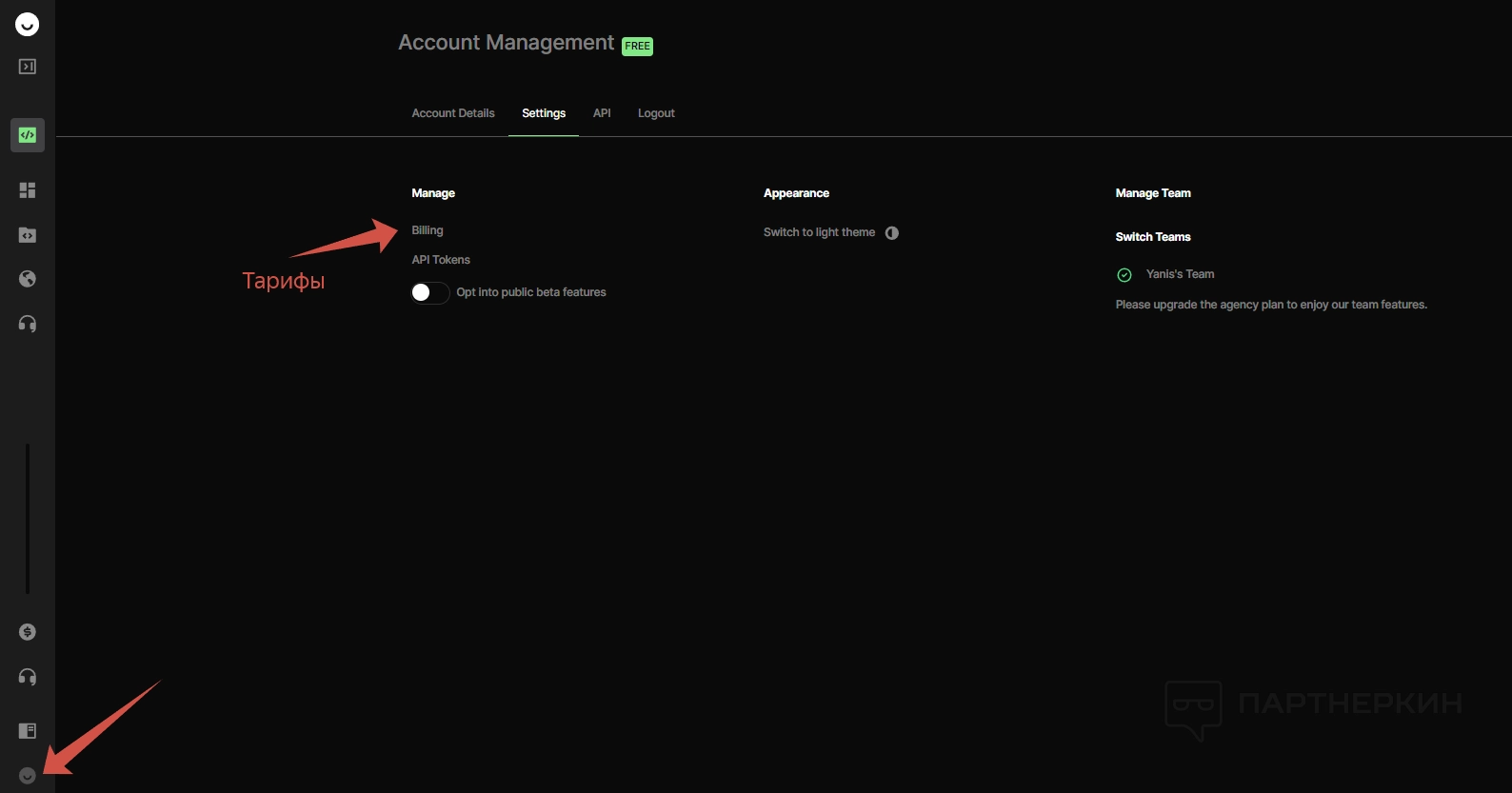 Кликнув на значок в нижней части экрана, пользователь попадет в настройки аккаунта. Здесь можно изменить имя, электронную почту и пароль, включить двухфакторную аутентификацию, воспользоваться API и оплатить подходящий тариф.