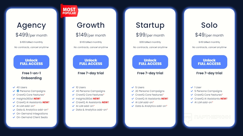 - Growth ($149 в месяц). Включает до 10 пользователей и до 40 кампаний Persona. Тариф открывает доступ ко всем основным возможностям CrawlQ, а также новинкам, таким как Insights360 и дополнительные аналитические инструменты;