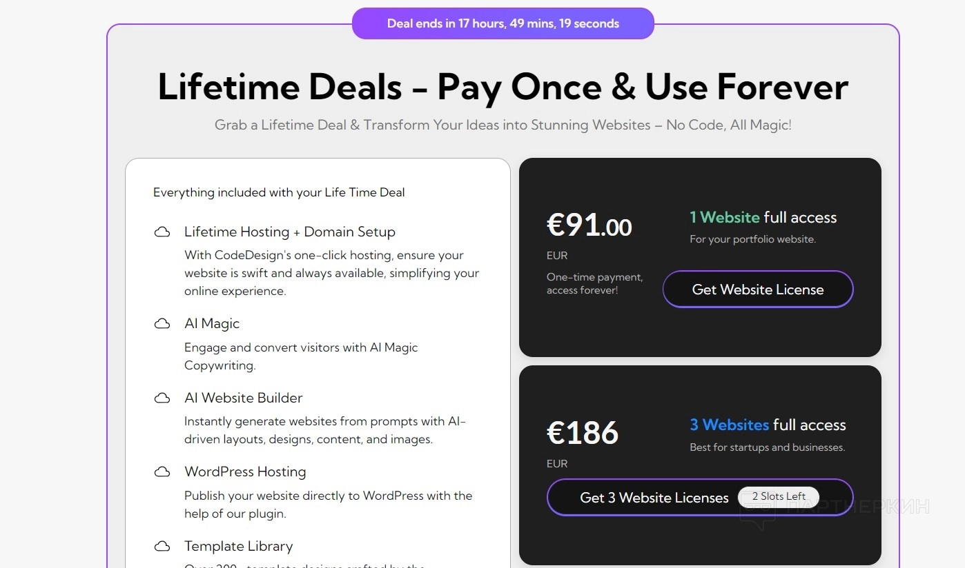 Особым предложением является пожизненная подписка, которая после единоразовой оплаты обеспечивает постоянный доступ к проекту. Количество пользователей, которые могут управлять проектом, варьируются: €91 — 1 пользователь, €186 — 3 пользователя, €464 — 10 пользователей. За дополнительную плату можно добавить больше пользователей, согласовав это с службой поддержки.