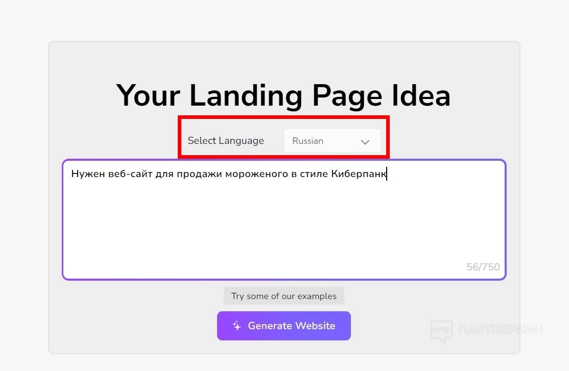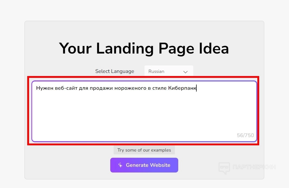 - Введите описание. Что это будет: маркетплейс, посадочная страница и так далее. Также укажите тематику и все необходимые детали. Например «Нужен веб-сайт для продажи мороженого в стиле Киберпанк».