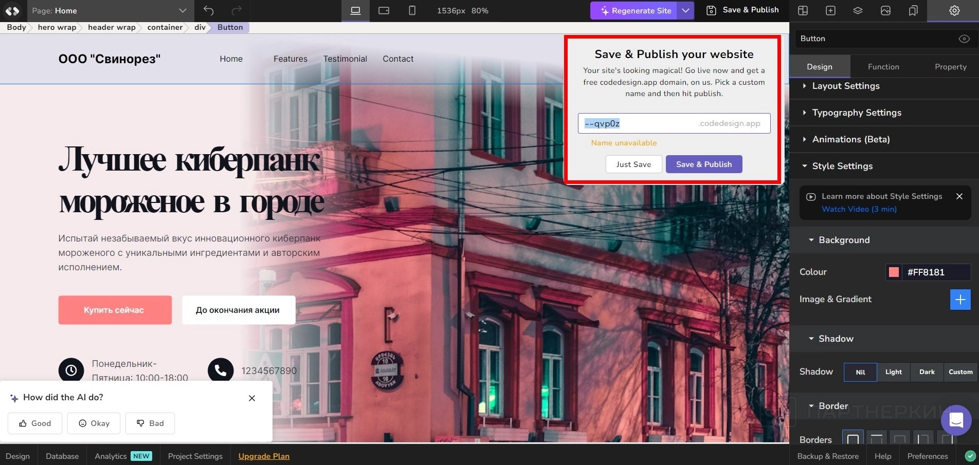 Сайт можно сохранить или «сохранить и опубликовать». После публикации проекта, ему присваивают доменное имя сервиса. Потом его можно сменить. У платформы есть свой хостинг и широкий выбор доменных имен.