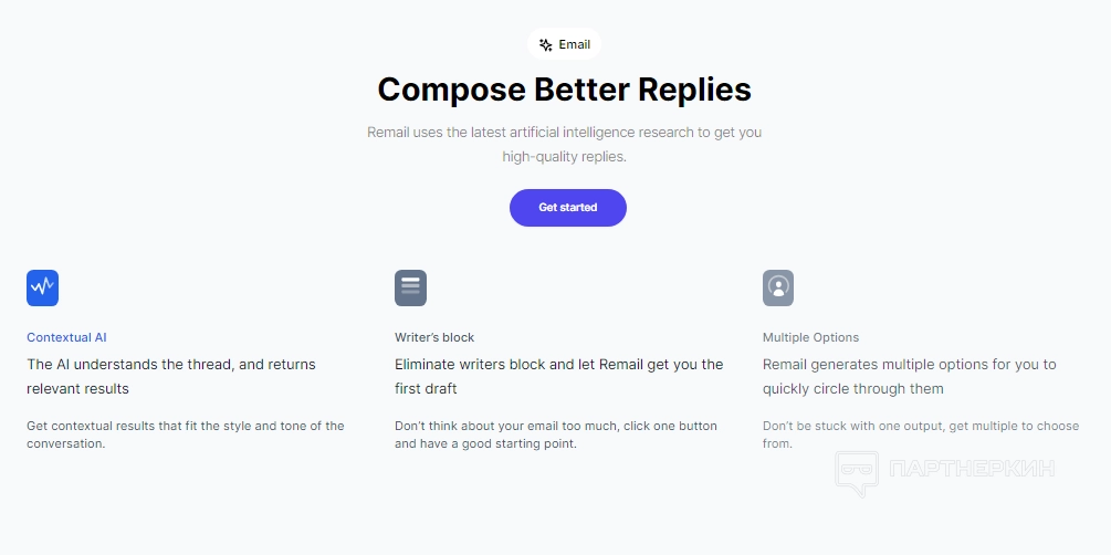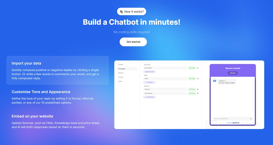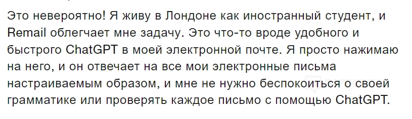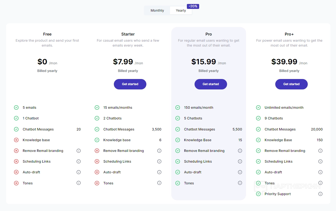 - Pro. Тариф включает 150 писем в месяц, 5 чат-ботов с 5 500 сообщениями, доступ к базе знаний, удаление брендинга Remail, функции планирования и авто-черновика. Стоимость составляет $15,99 в месяц при ежегодной оплате;
