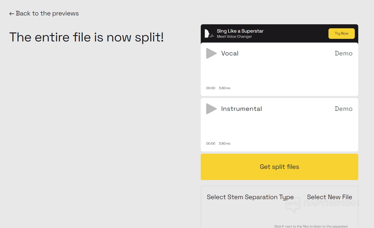 На бесплатном тарифе скачать вокал и инструментал отдельно нельзя. При нажатии кнопки «Get split files» появится уведомление, где будет сказано, что пользователю необходимо приобрести один из тарифных планов.