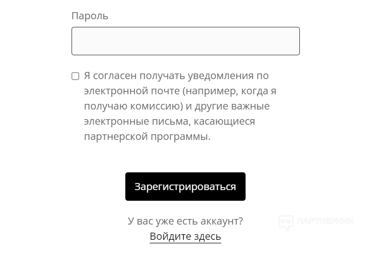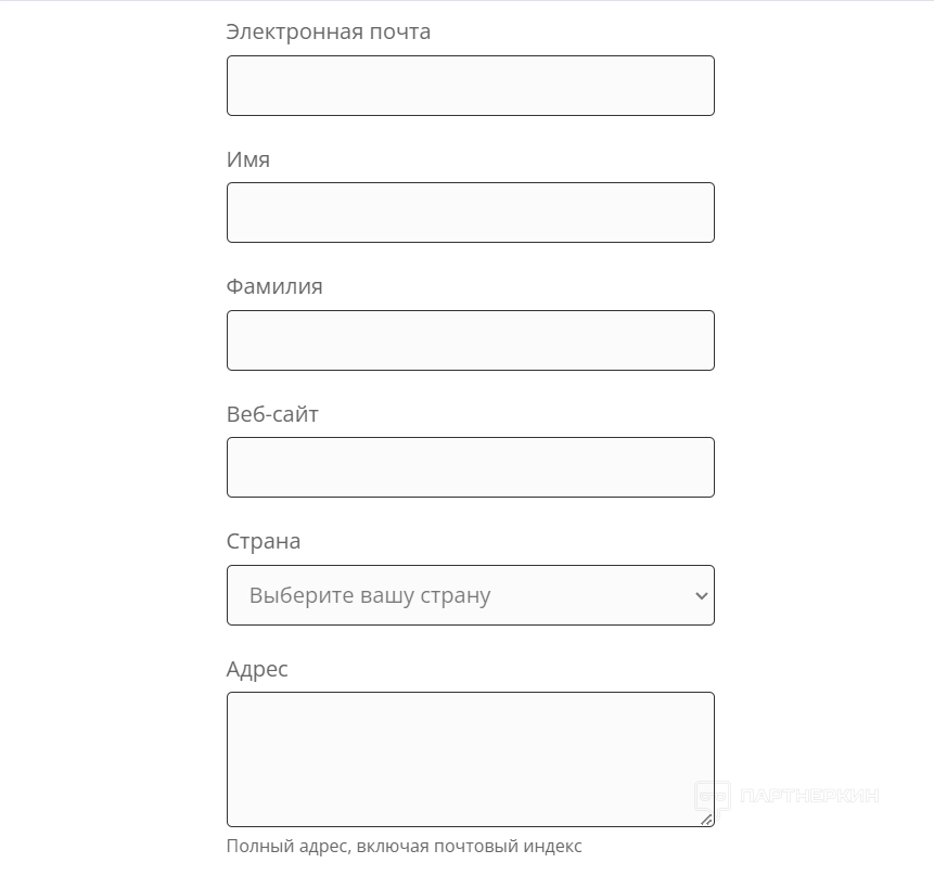 Форма партнерской программы максимально простая. Пользователю необходимо указать электронную почту, имя и фамилию, веб-сайт, страну, полный адрес (включая почтовый индекс) и пароль. По желанию — дать согласие на получение уведомлений.