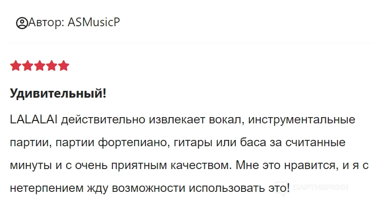 Автор ASMusicP отмечает, что сервис извлекает вокал, инструментальные партии, партии фортепиано, гитары за считанные минуты.
