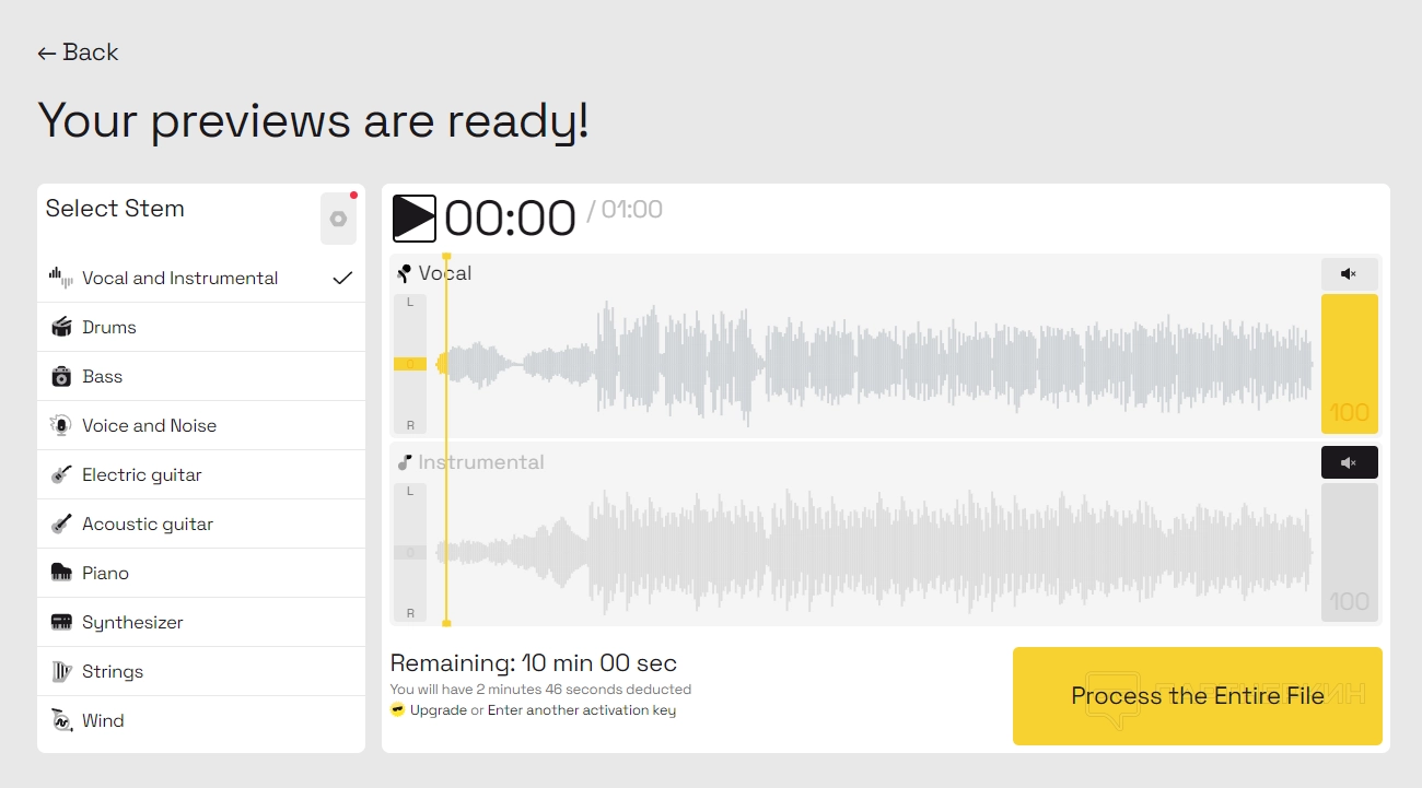 Мы загрузили один трек (на бесплатном тарифном плане доступно 10 минут). На верхней дорожке представлен вокал, на нижней — инструментал. Чтобы скачать файлы, необходимо нажать «Process the Entire Files».