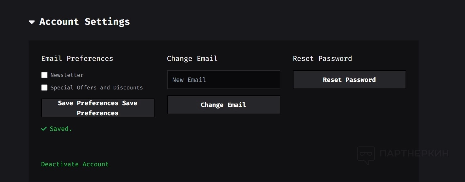 - Account Settings. Настройка учетной записи. Можно изменить email или пароль. Также есть опции по получению уведомлений.