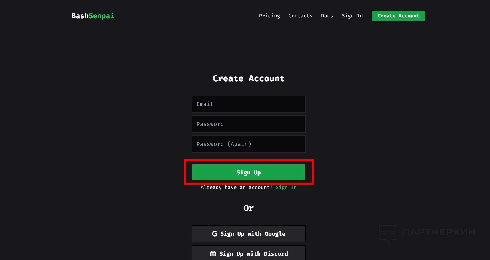 - Заполните форму. Укажите ваш email, придумайте пароль, повторите его второй раз.