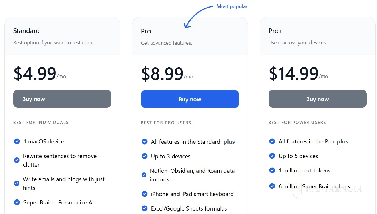 - Pro Plus — $14,99/месяц. Включает все функции Pro плана и дополнительные премиум-опции. Оптимален для профессионалов и компаний, которые нуждаются в самых мощных инструментах для написания и автоматизации текста. Предоставляет неограниченный доступ к сервисам и поддержку на всех устройствах.