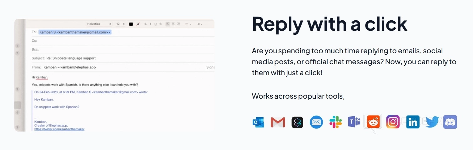Elephasявляется возможность мгновенно отвечать на электронные письма и сообщения с помощью одного клика. Это упрощает повседневные коммуникации и экономит время.
