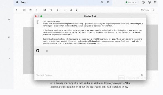 Elephas.appиспользует контекстуальное понимание текста для адаптации ответов и предложений в зависимости от места и способа использования. Например, если вы пишете электронное письмо или пост в блоге, Elephas поймёт разницу и предложит соответствующий стиль и тон: