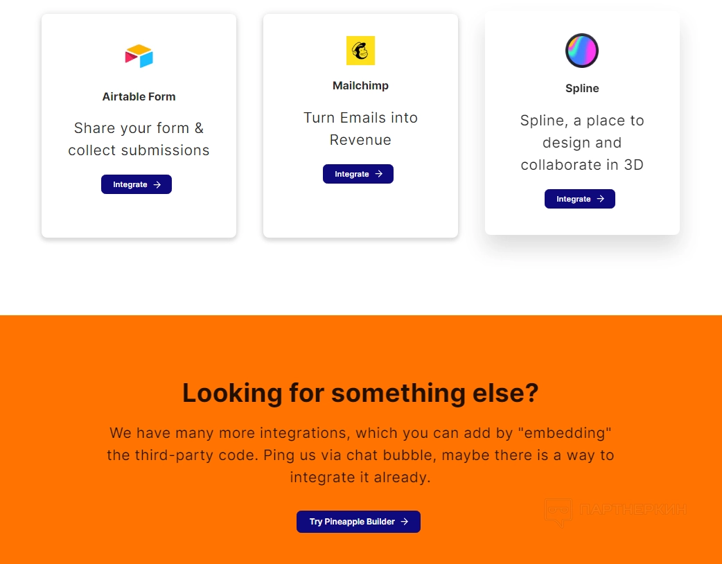 С помощью интеграций можно добавить сторонние виджеты, службы поддержки клиентов с ботом, расширенные формы для заказов и обратной связи. Также можно собирать и добавлять отзывы пользователей с других платформ.