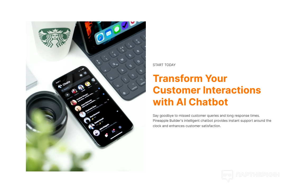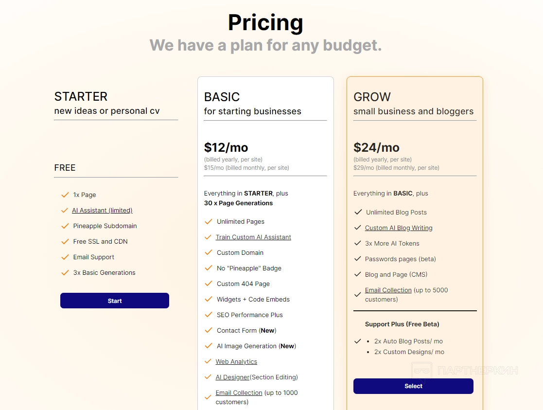 Тариф Basic ($12 в месяц) включает в себя создание неограниченного количества страниц, обучение AI-ассистента, пользовательский домен и отсутствие на сайте брендинга Pineapple.