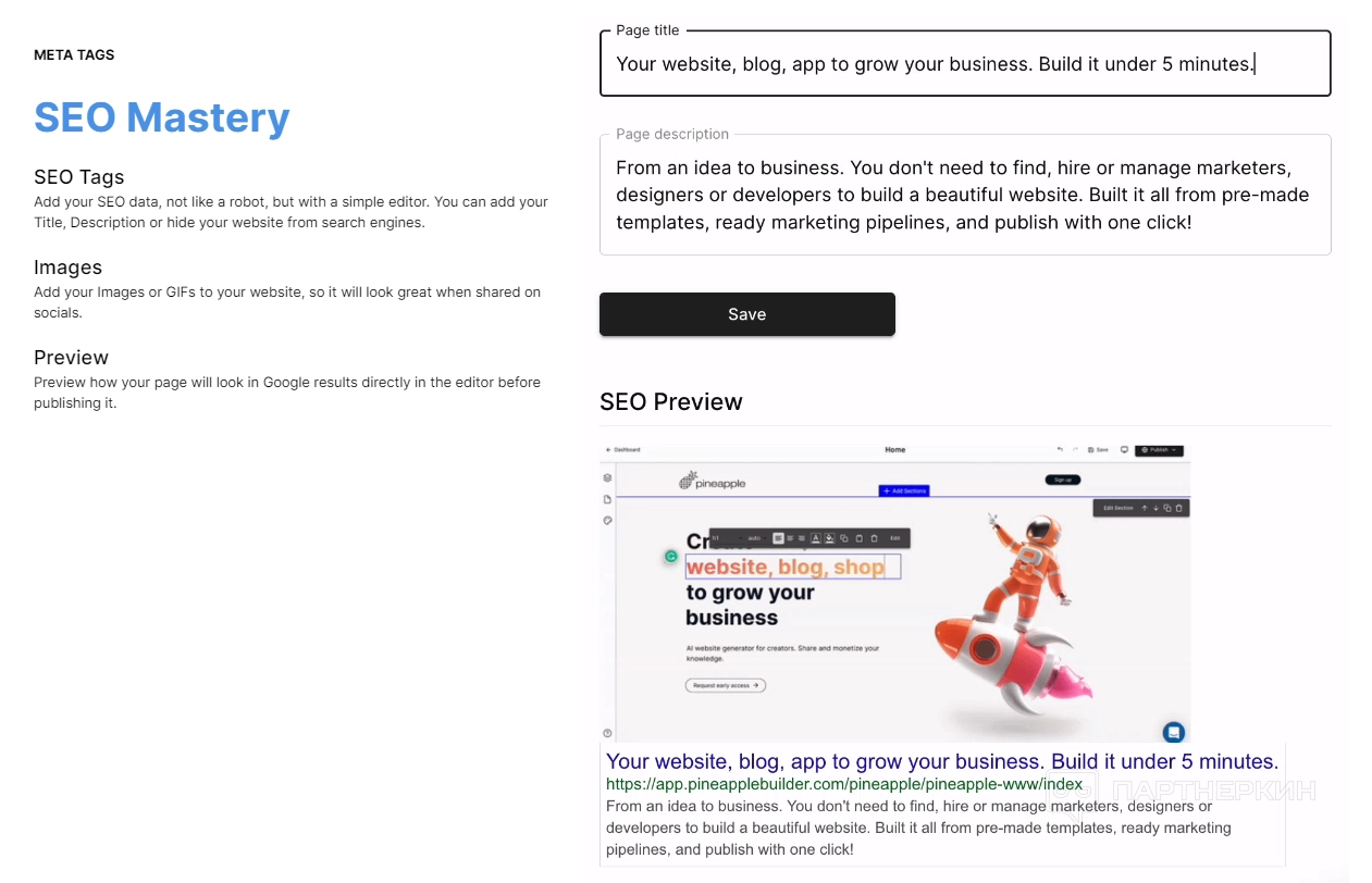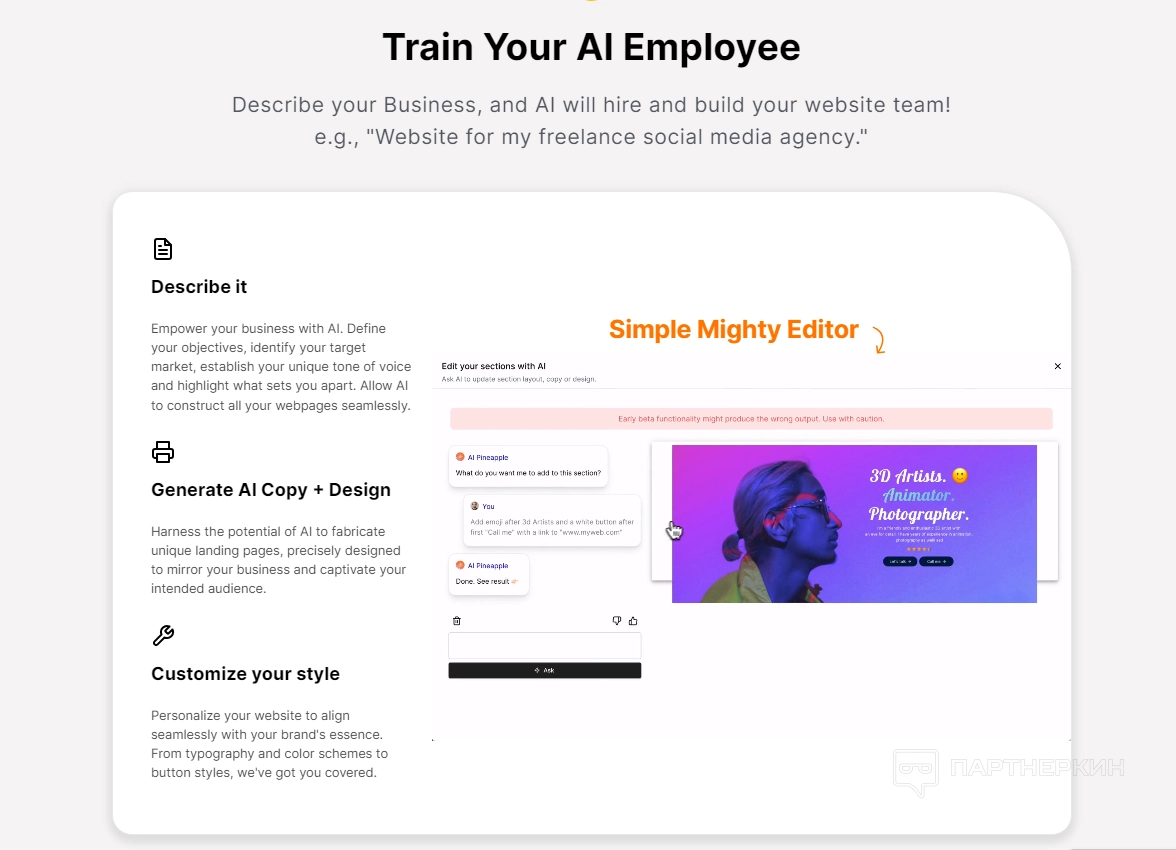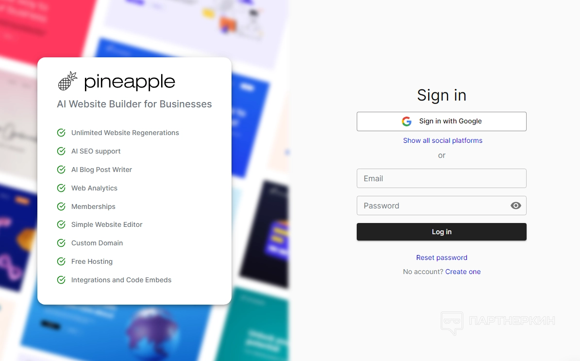 Платформа предлагает пользователям бесплатный и платные тарифы. Бесплатный позволяет создать три одностраничных сайта и имеет ограничения по возможностям AI-ассистента. Публикация сайтов возможна только с доменом .pineapple.page.