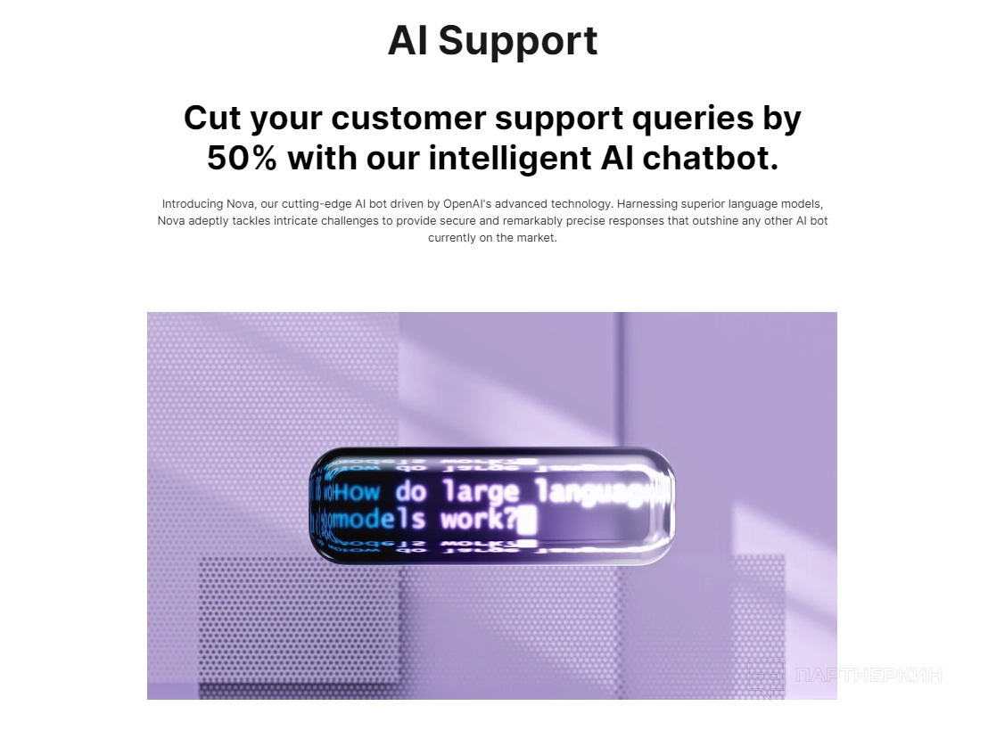 Платформа предоставляет возможность внедрения чат-бота Nova с ИИ, который помогает снизить количество запросов в службу поддержки клиентов до 50%.