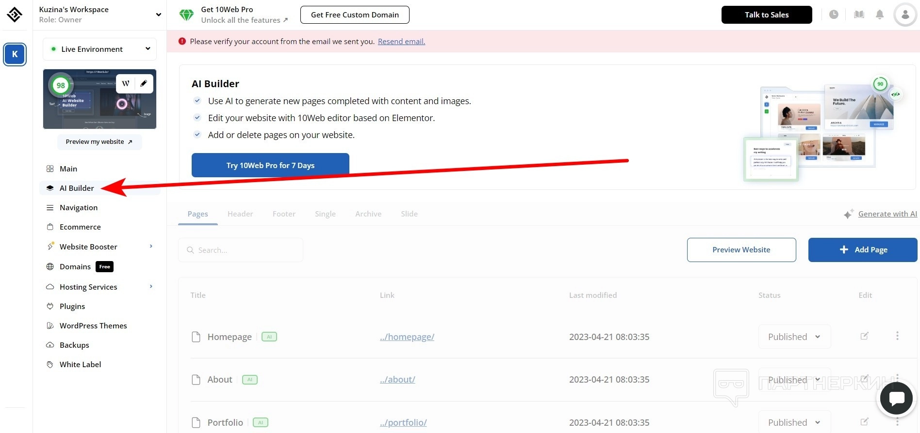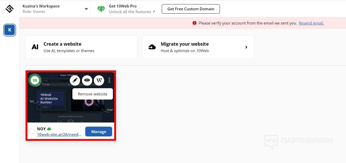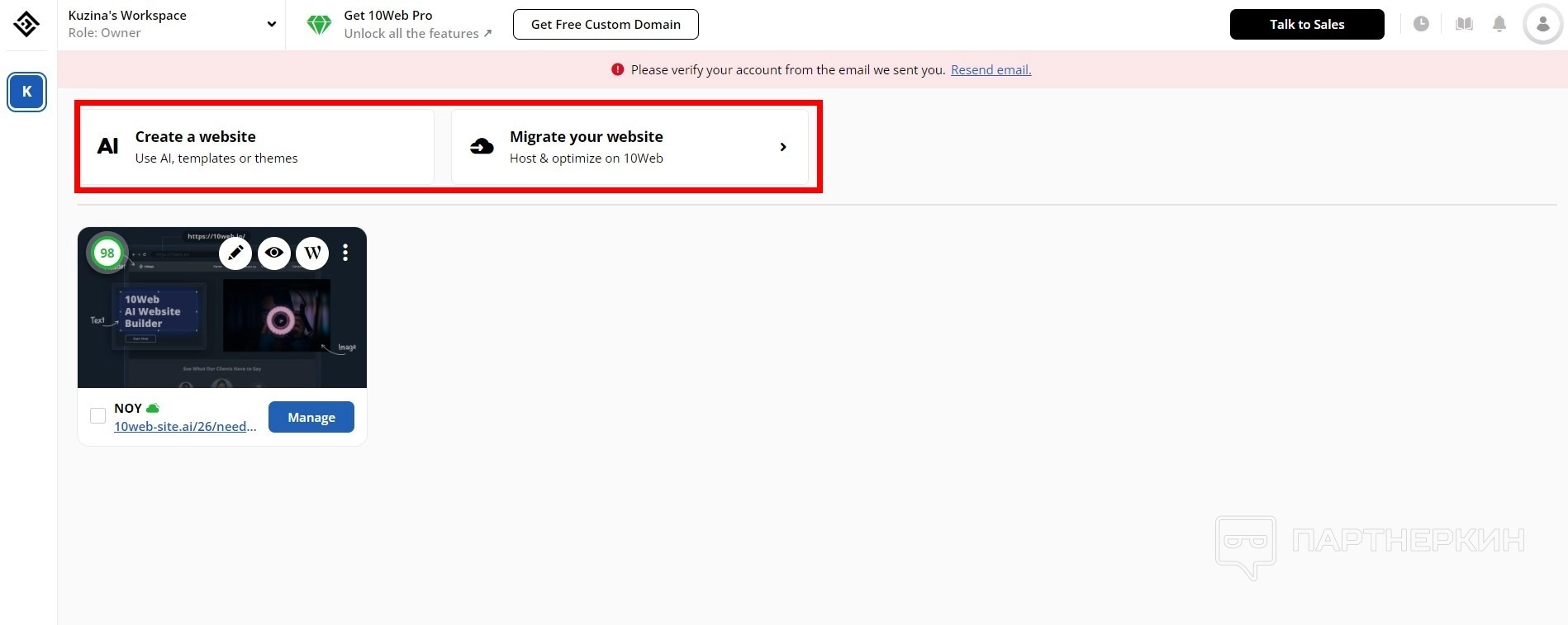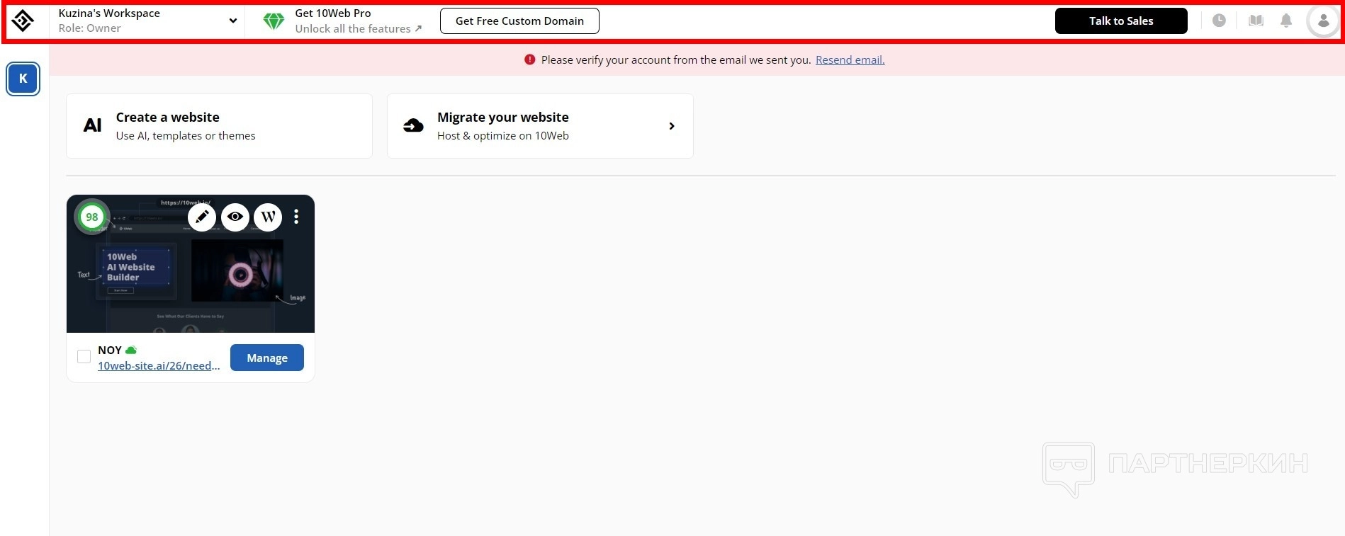 - Workspace . Рабочая область с доступом к проектам. Здесь отображаются все сгенерированные и перемещенные сайты.