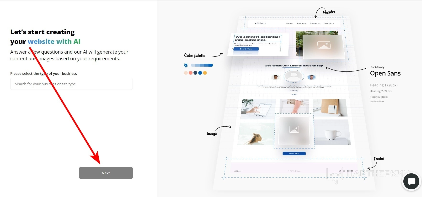 - Чтобы сгенерировать новый сайт, выбирайте первый вариант — Create a new website with AI . Дальше система задаст несколько вопросов, чтобы адаптировать страницы под запросы клиента: для какой ниши вы хотите создать сайт, как называется ваша компания, хотите ли вы получить бесплатный домен. На каждой странице после всех ответов нажимайте на кнопку Next .