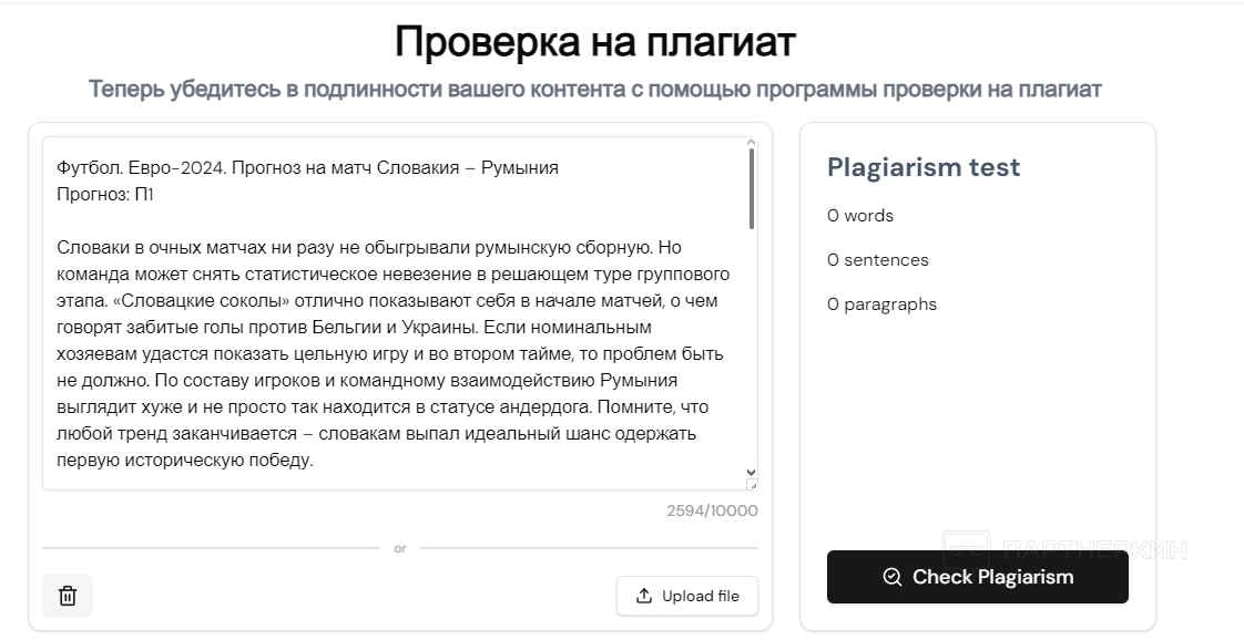 Чтобы убедиться в подлинности контента, можно воспользоваться инструментом «Проверка на плагиат». Загрузим любой текст, уже опубликованный на сайте, и нажмем кнопку Check Plagiarism.