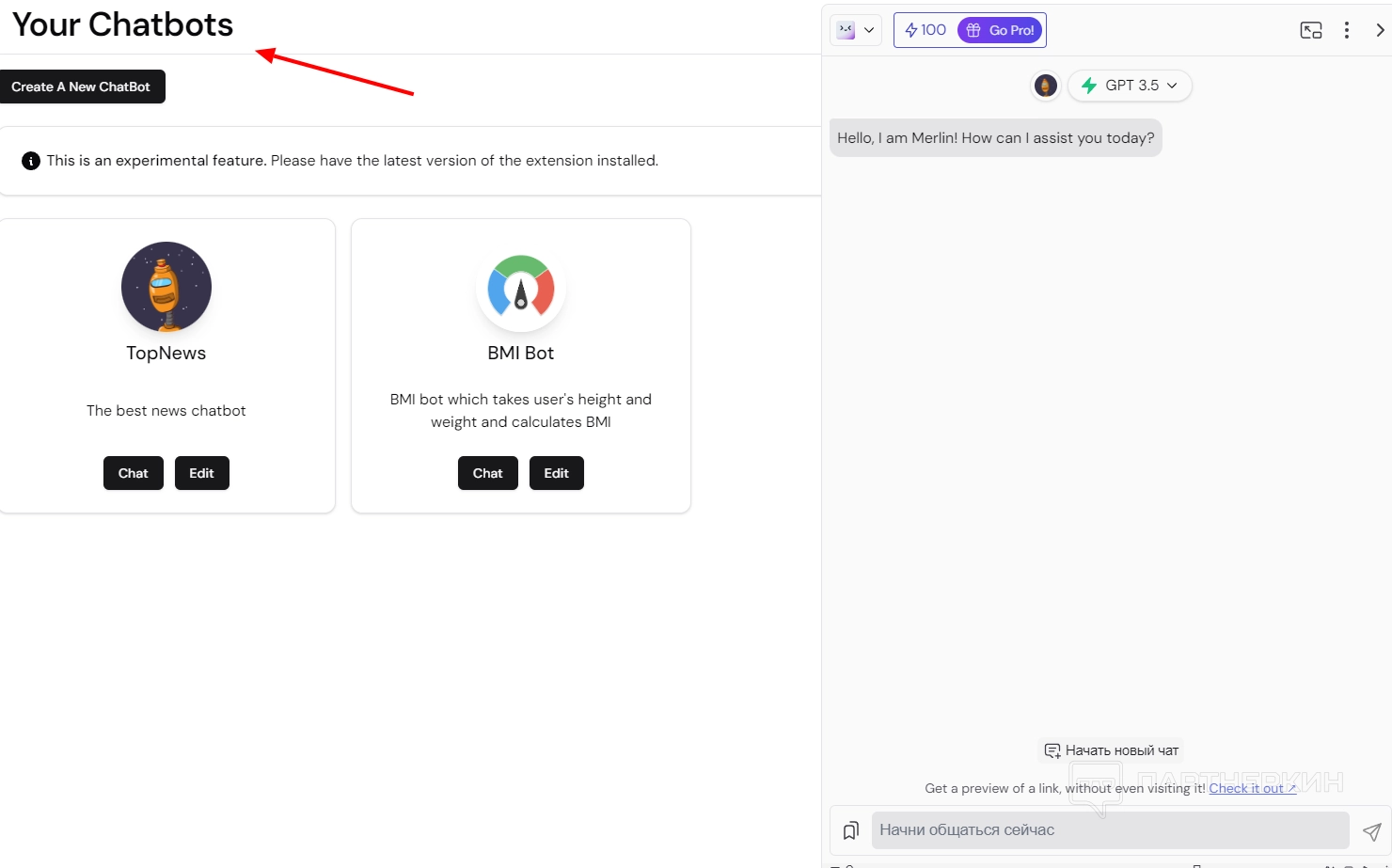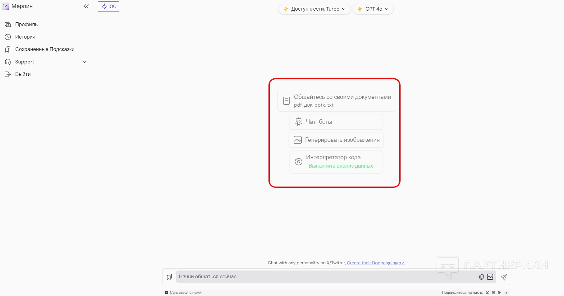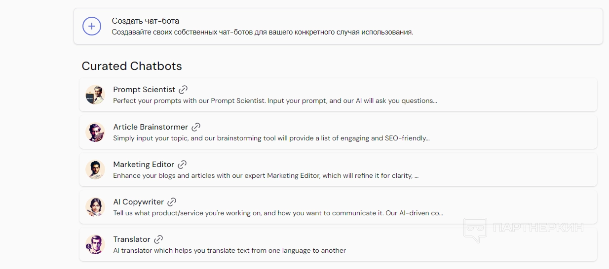 Пользователь может создать чат-бот. Есть готовые варианты ботов для исследователей, маркетологов, переводчиков, копирайтеров и других специалистов.