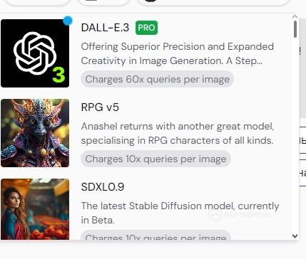 В правом верхнем углу нужно выбрать нейросеть для генерации изображений. DALL-E 3 работает на версии PRO. Выберем что-нибудь попроще, например, SDXL0.9.