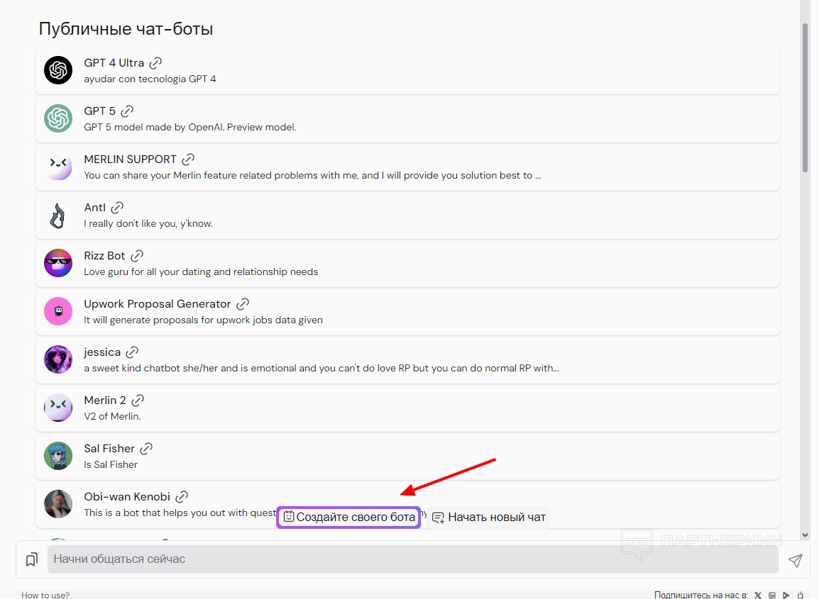 Ниже представлен список публичных чат-ботов. Для создания своего бота нажмите кнопку: