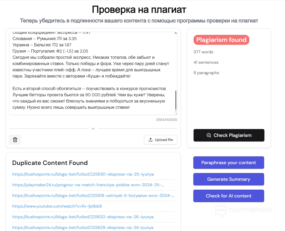 Сервис нашел плагиат — указано количество слов, предложений и параграфов. Мы также видим, что ИИ-сервис предлагает перефразировать контент, сгенерировать краткий пересказ и проверить его на AI-контент. Все это доступно за дополнительные кредиты.