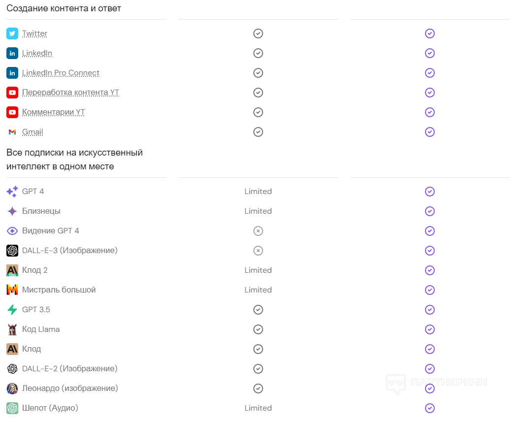 - работа с лучшими ИИ-моделями без ограничений (GPT-4, Claude-3, Mistral Large, Gemini);