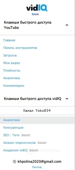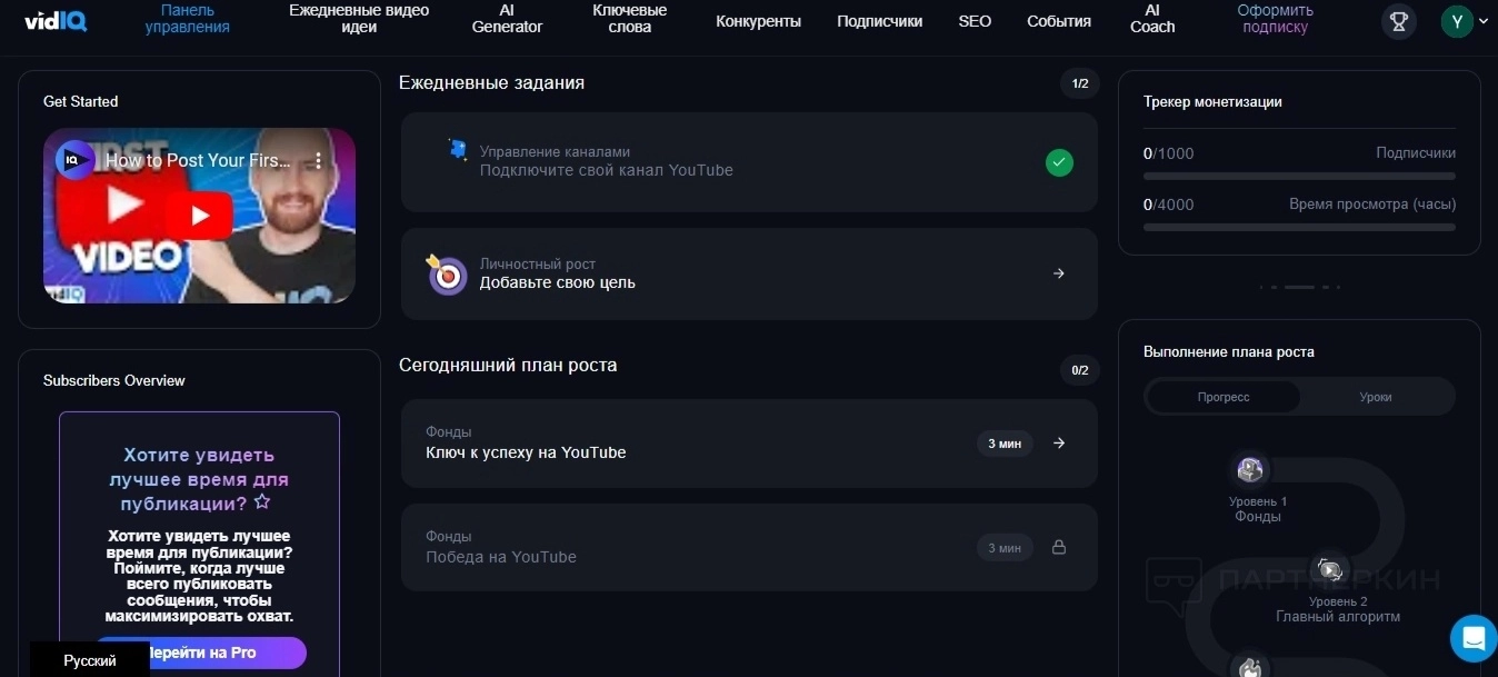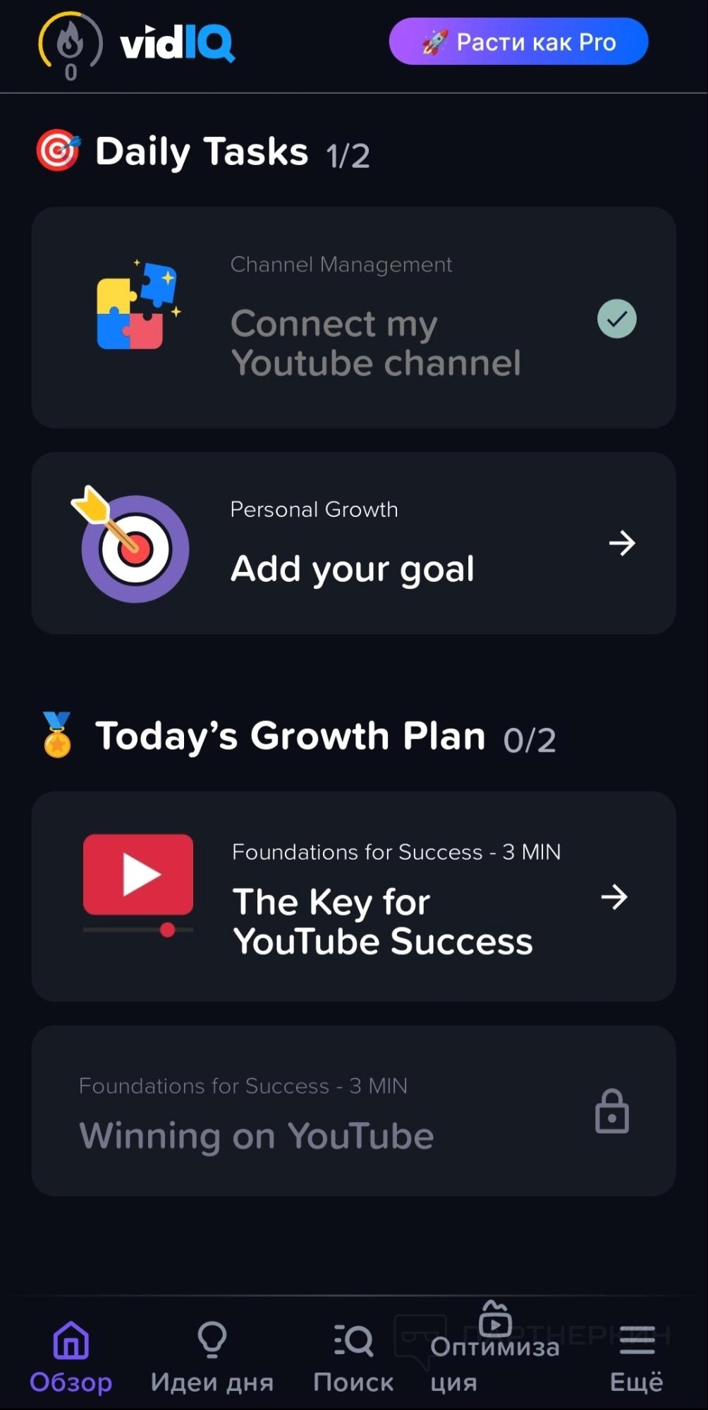 - аналитика VidIQ — раздел для работы с каналом, но уже в сервисе VidIQ, где отслеживаются поставленные цели и предлагаются варианты оптимизации и продвижения;