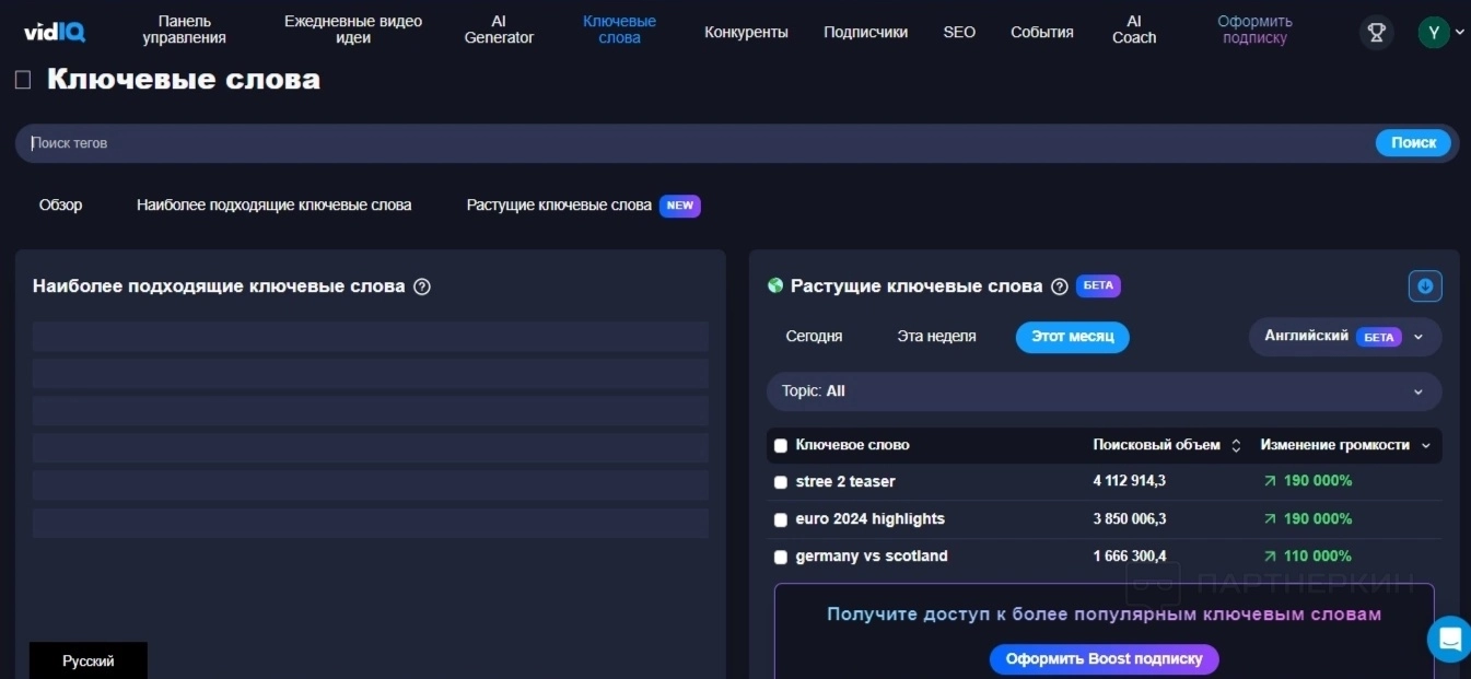 - поиск и подбор ключевых слов, имеющих высокую популярность в YouTube на данный момент;