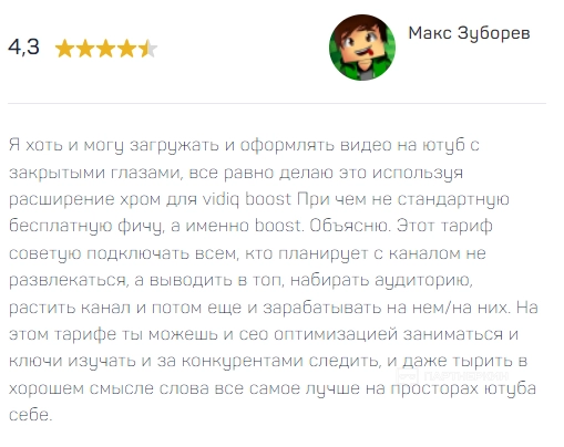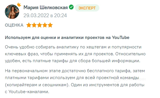 Например, пользователю Марии VidIQ нравится за множество функций и возмость использования сервиса сразу на нескольких уровнях проектной команды (сео и копирайтерами):