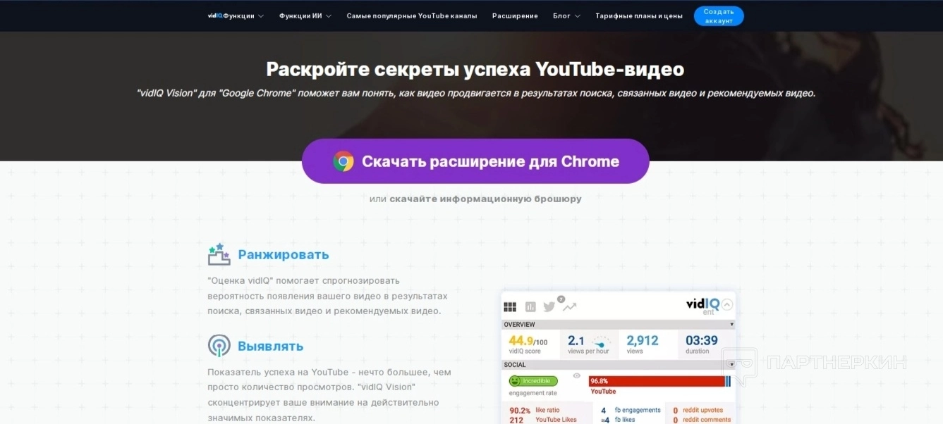 - Расширение для браузера и мобильное приложение . Для упрощения работы с каналом и регулярного ознакомления со статистикой без захода в личный кабинет на сайт, VidIQ разработал расширение для браузера и мобильное приложение. Пользователи могут в любой момент открыть свою статистику или посмотреть новую идею для будущего ролика.