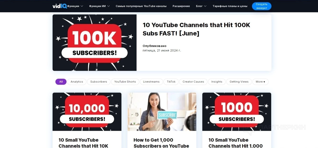 - Блог . VidIQ регулярно делится различными секретами, кейсами, гайдами и просто полезными знаниями в своем блоге. Статьи разбиты на несколько категорий (просмотры, монетизация, аналитика, подписчики, идеи и советы), поэтому здесь можно найти практически любую информацию, которая станет помощником в ведении канала.
