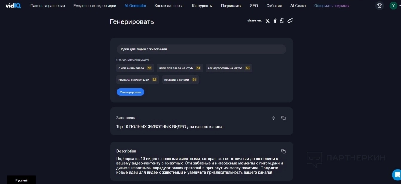 В целом, взаимодействие с платформой не выглядит сложной. Большинство инструментов начинают работать автоматически, сразу после добавления своего канала YouTube в систему. Полученные данные можно скачивать или настраивать сразу же для будущих видео, а искусственный интеллект сгенерирует любые идеи, заголовки, теги и так далее.