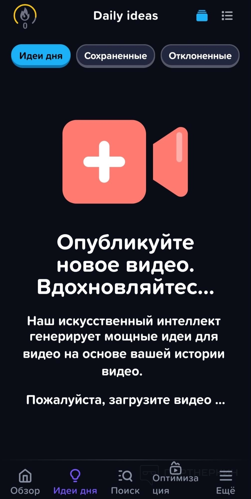 Ежедневные идеи . Первый раздел для работы, в котором пользователь может искать, сохранять или критиковать подобранные идеи для создания своих видеороликов. Использовать инструмент достаточно просто: в предоставленном списке клиент ищет подходящую идею, которую может отметить значком сердечка или крестиком, что означает сохранение и отказ соответственно. В дальнейшем, варианты можно просмотреть заново и начать снимать ролик.