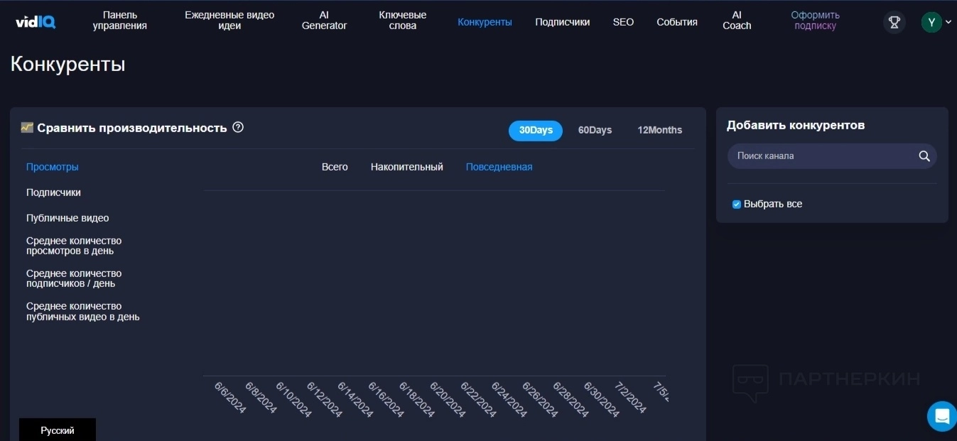 Конкуренты . Раздел для отслеживания и сравнения своего канала с каналами выбранных конкурентов.