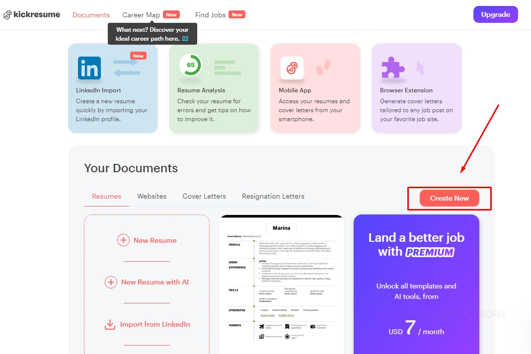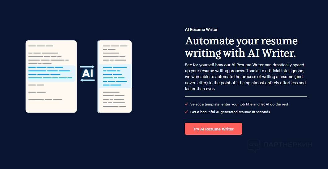 - Резюме . Здесь пользователи могут начать процесс создания нового резюме с помощью ИИ или просмотреть готовые примеры. Также пользователи могут использовать мгновенную проверку резюме для получения оценки и сравнить его с другими.